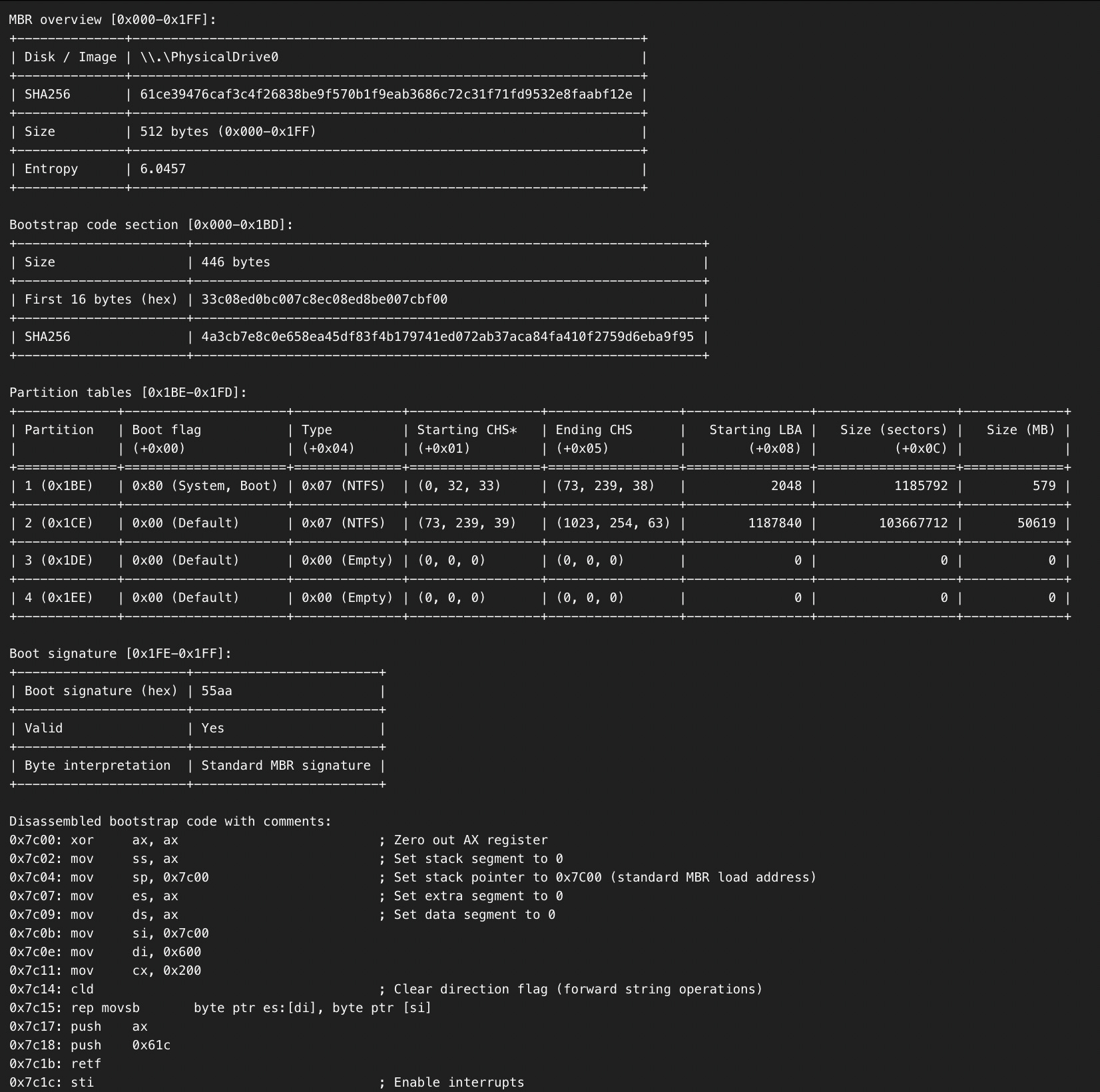 The tool (link) can be used for triage and can extract MBR from either system partition or mounted disk image. See example analysis report output on the screenshot below. Try it out and let me know how it works!